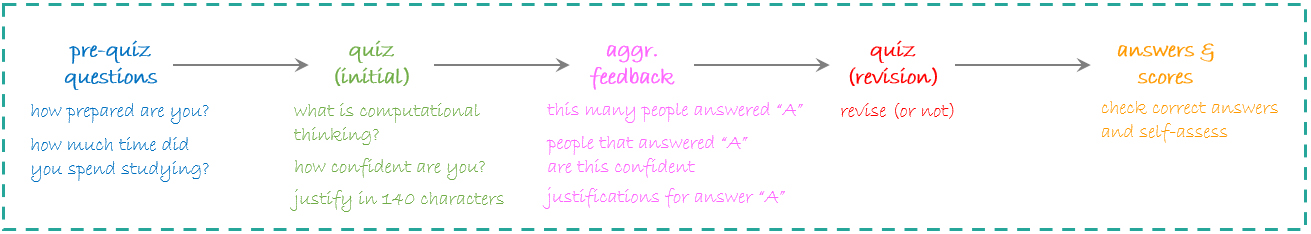 Welcome to the Self-Assessment/Group Awareness (SAGA) tool!SAGA uses several feedback metrics to depict classroom performance and support self-assessment and group awareness. Apart from the percentage each question choice received (e.g., “A: 24%; B: 54%; C: 14%; D: 8%”), SAGA uses additional feedback metrics that allow for a better understanding of the people behind each question choice (e.g., students’ self-perceived preparedness and confidence, short open-text justifications). The number and type of feedback metrics in a quiz can be easily modified by the quiz creator.